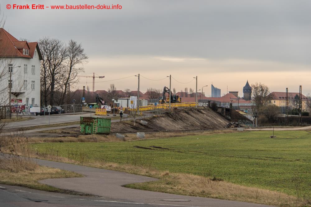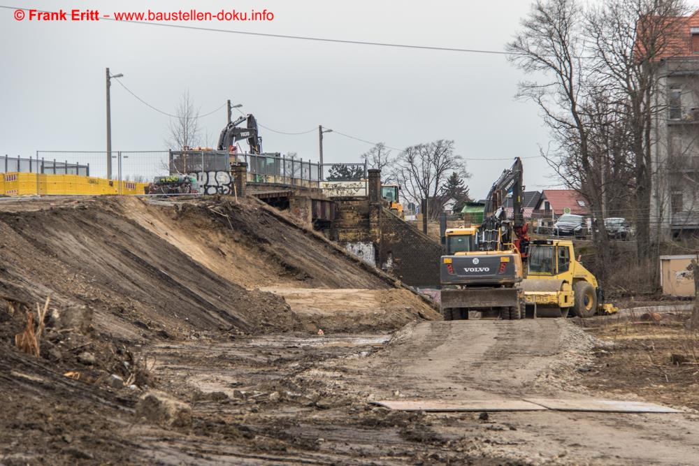 Beräumung der Böschungen, Vorbereitungen zum Bau der Hilfsbrücke für Fußgänger