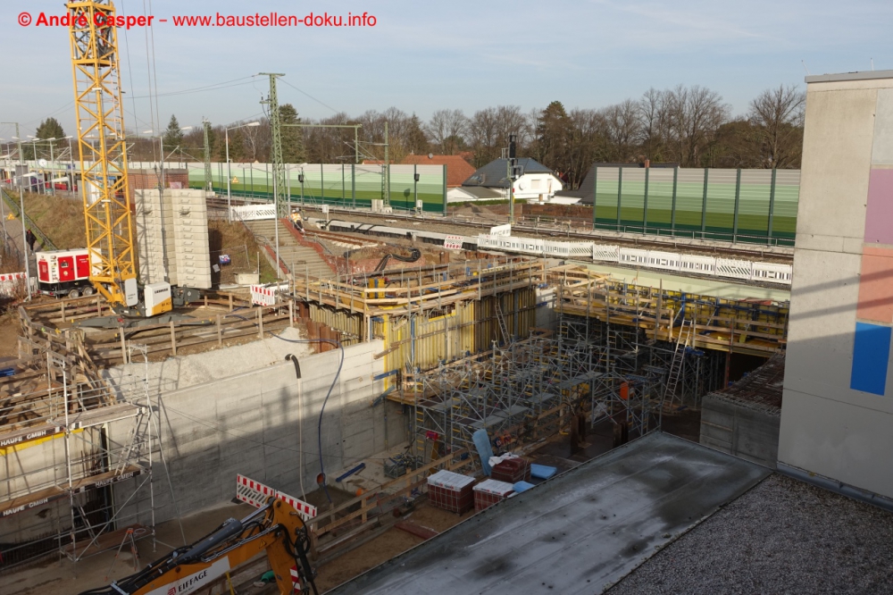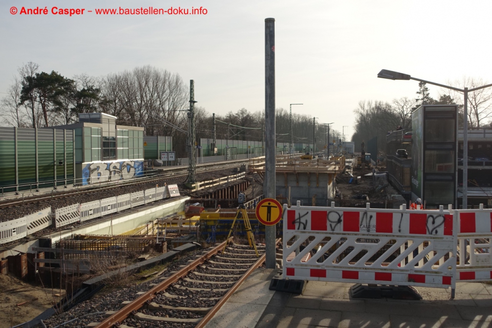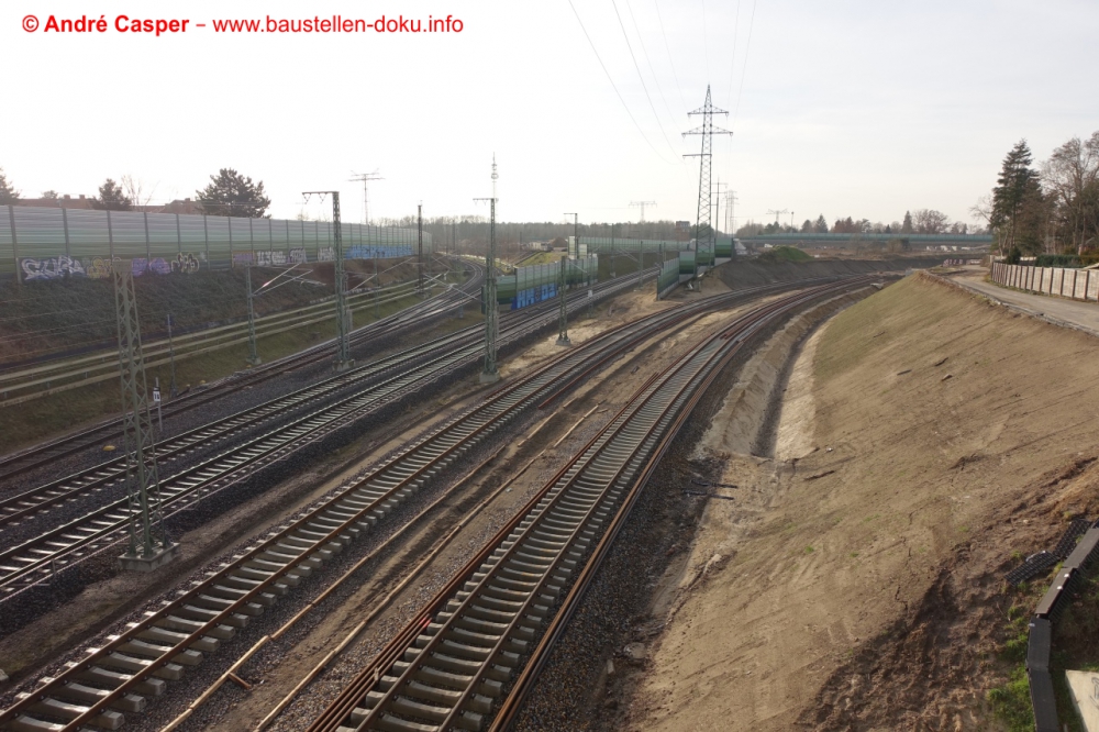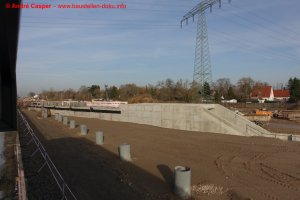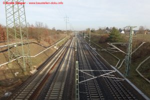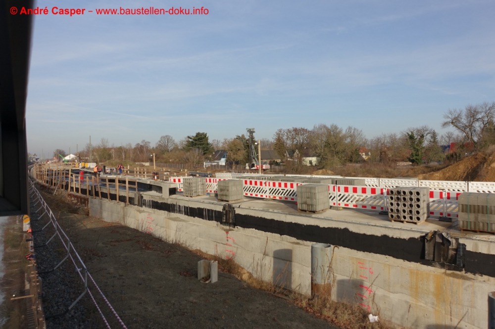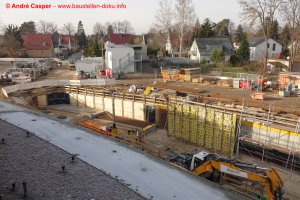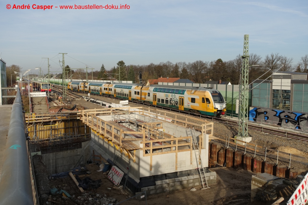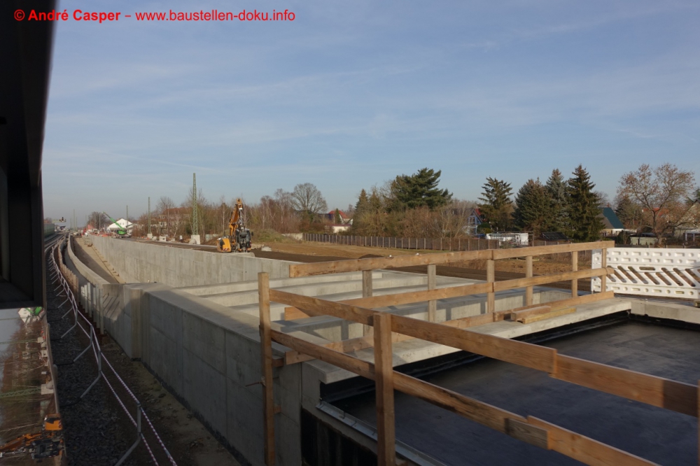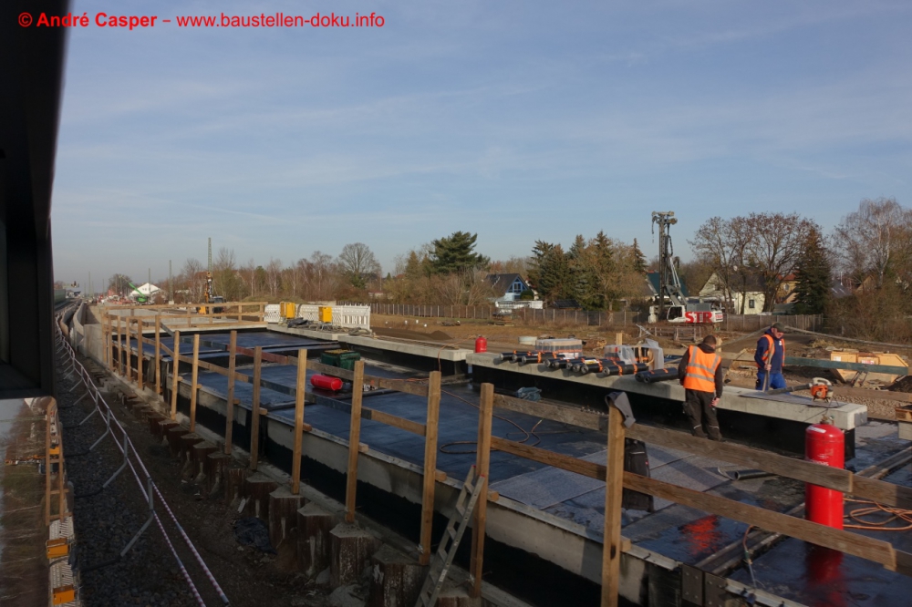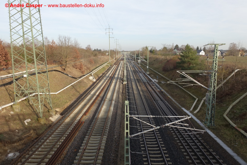 Blankenfelde: Errichtung EÜ Karl-Marx-Straße, Gleisbau und Oberleitung weitgehend fertig; Mahlow: Kreuzungsbauwerk rohbaufertig, Straßenanlagen fertiggestellt, Beginn Gleisbau