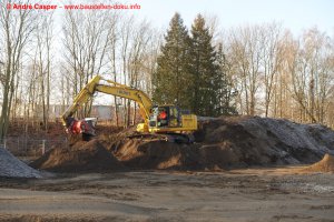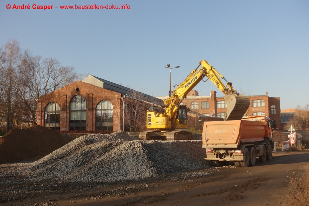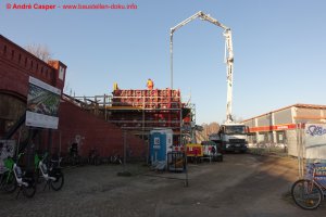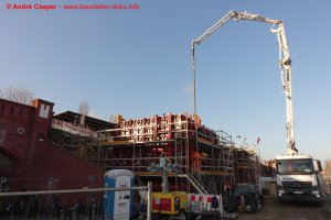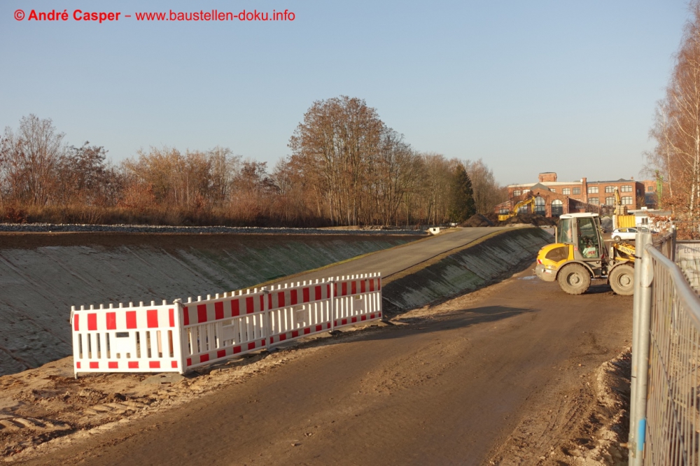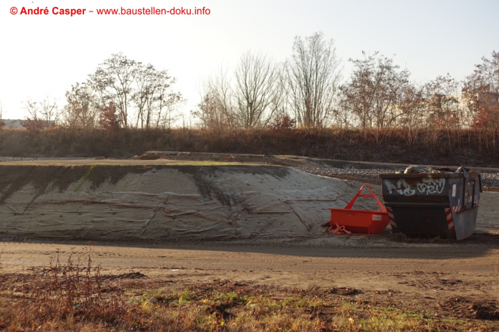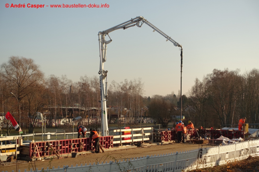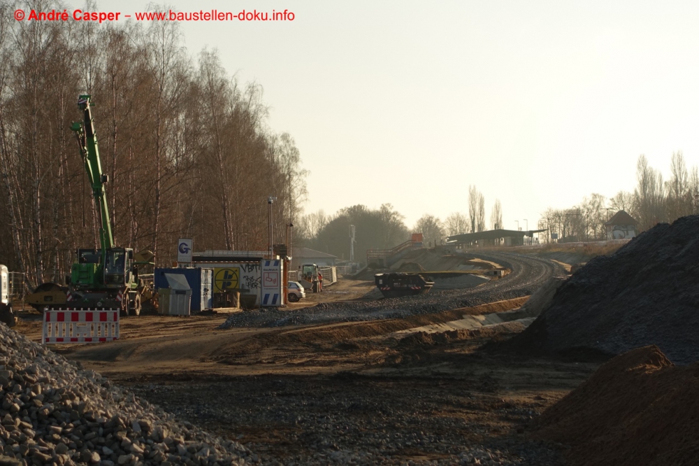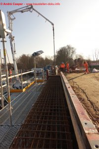 Bahnsteig rohbaufertig; Ausbringen des Gleisschotters; Betonage der Stützwand