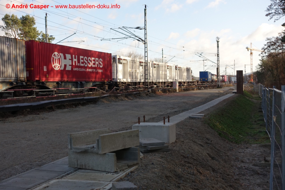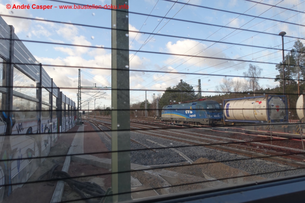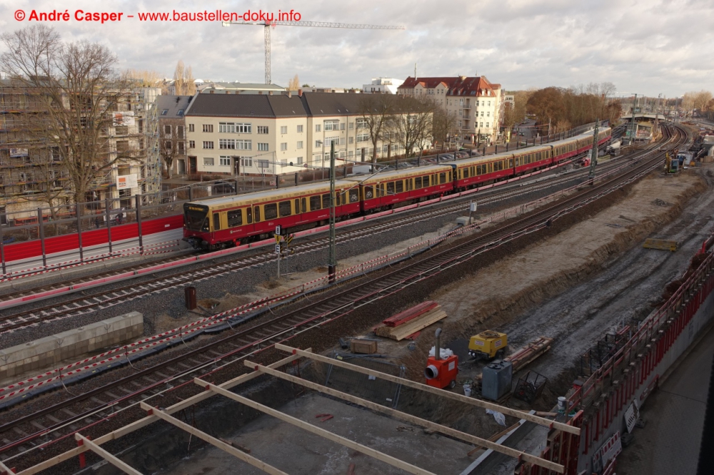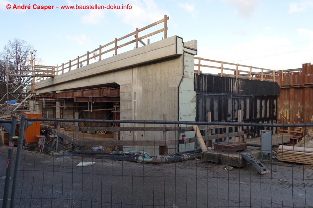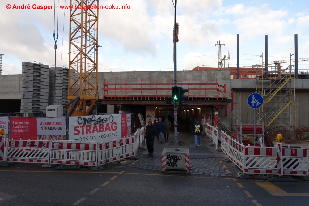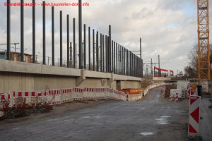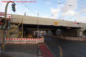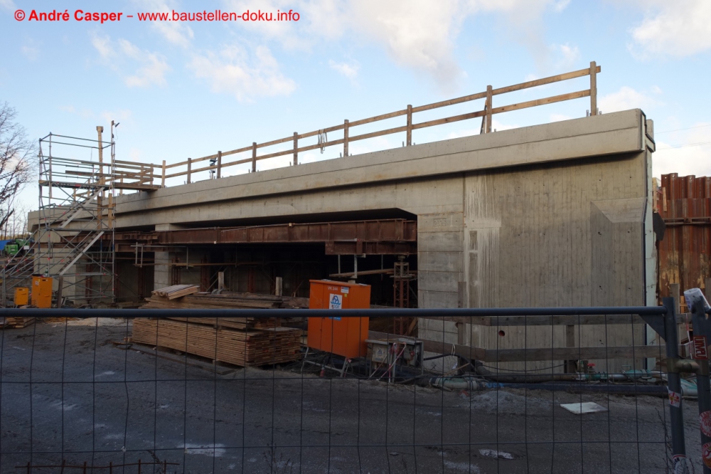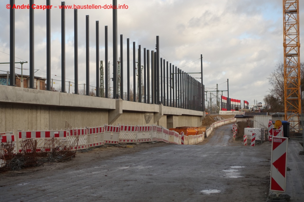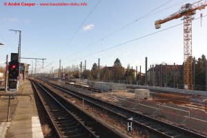 EÜ Hämmerlingstraße und EÜ Wuhle rohbaufertig; EÜ Bahnhofstraße (Süd) fertiggestellt; Bahnhofsgebäude und Stützwand am Elcknerplatz rohbaufertig; Fundamentarbeiten für den Regionalbahnsteig