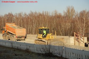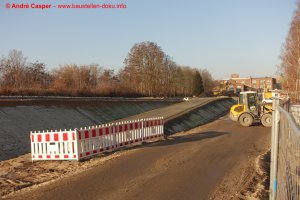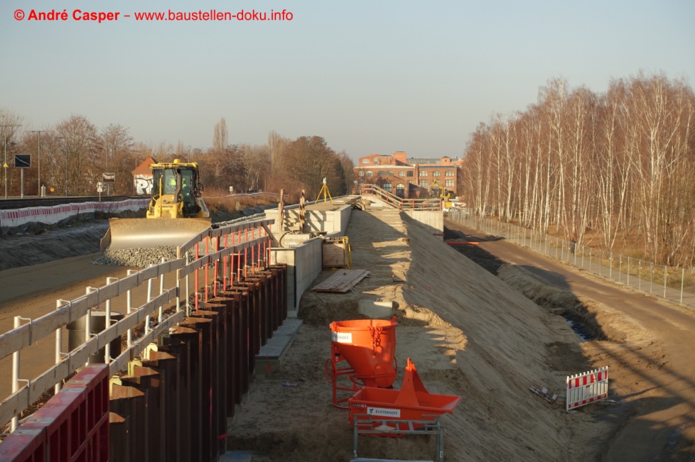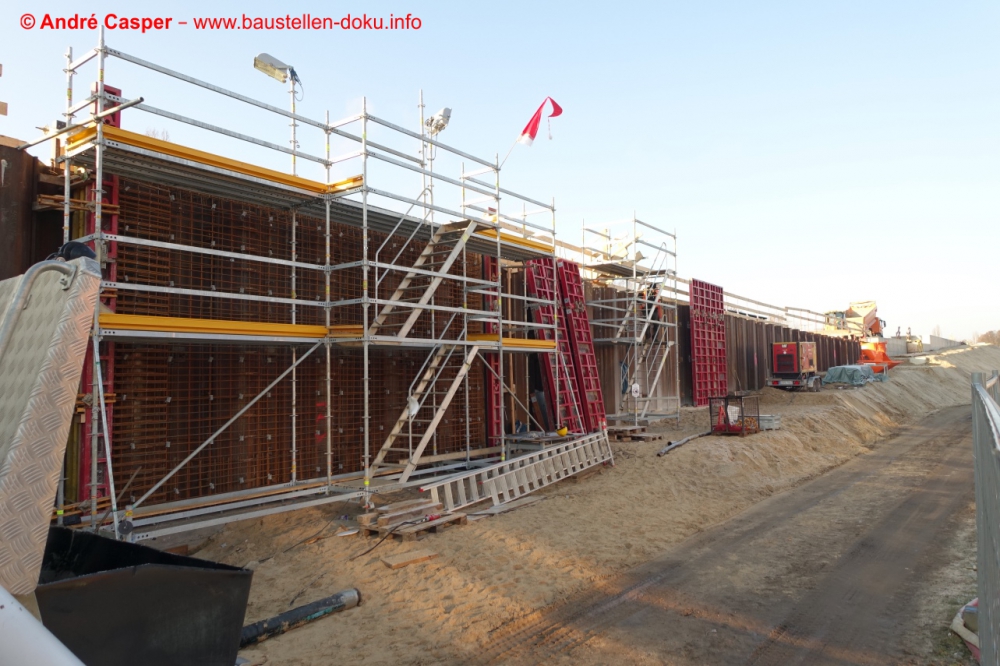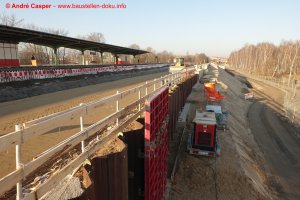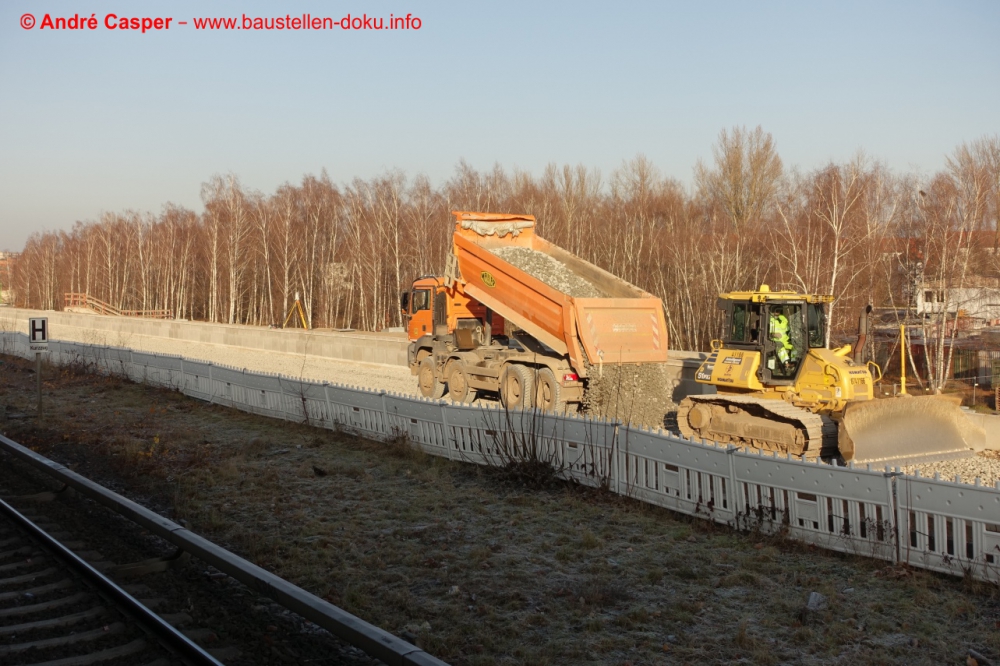 Bahnsteig rohbaufertig; Ausbringen des Gleisschotters; Betonage der Stützwand