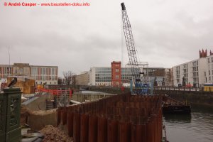 Richtfest am rohbaufertigen U-Bahnhof Museumsinsel; Gleise komplett durchgebunden; Rückbau des Fangedamms am Spreekanal