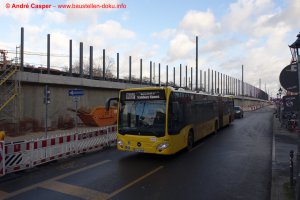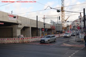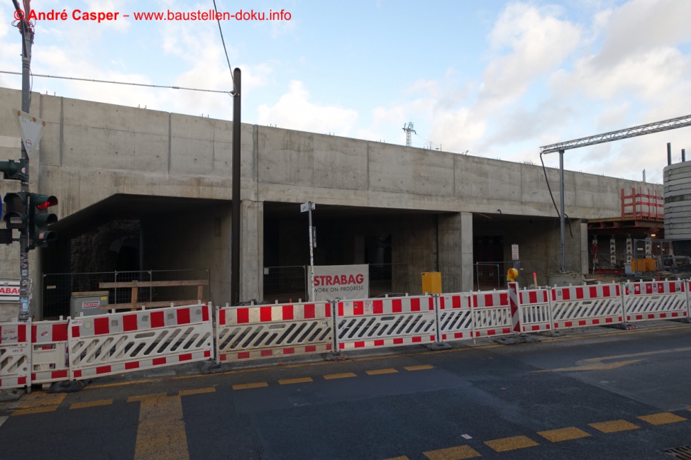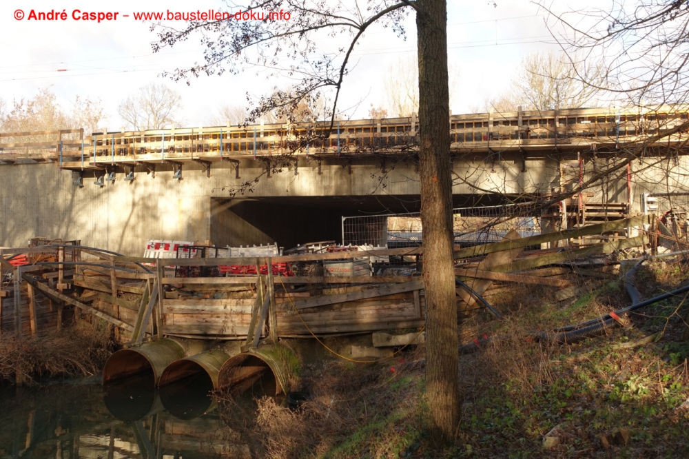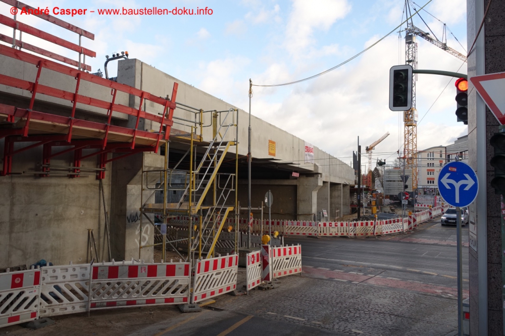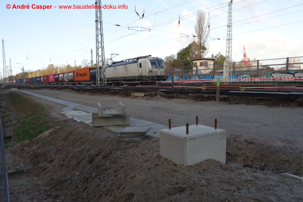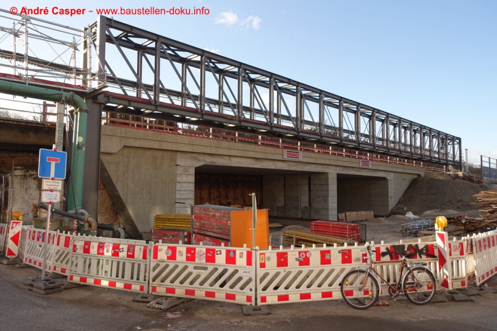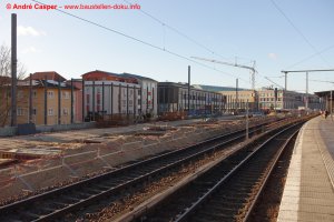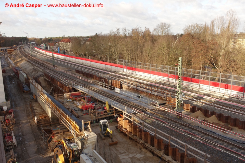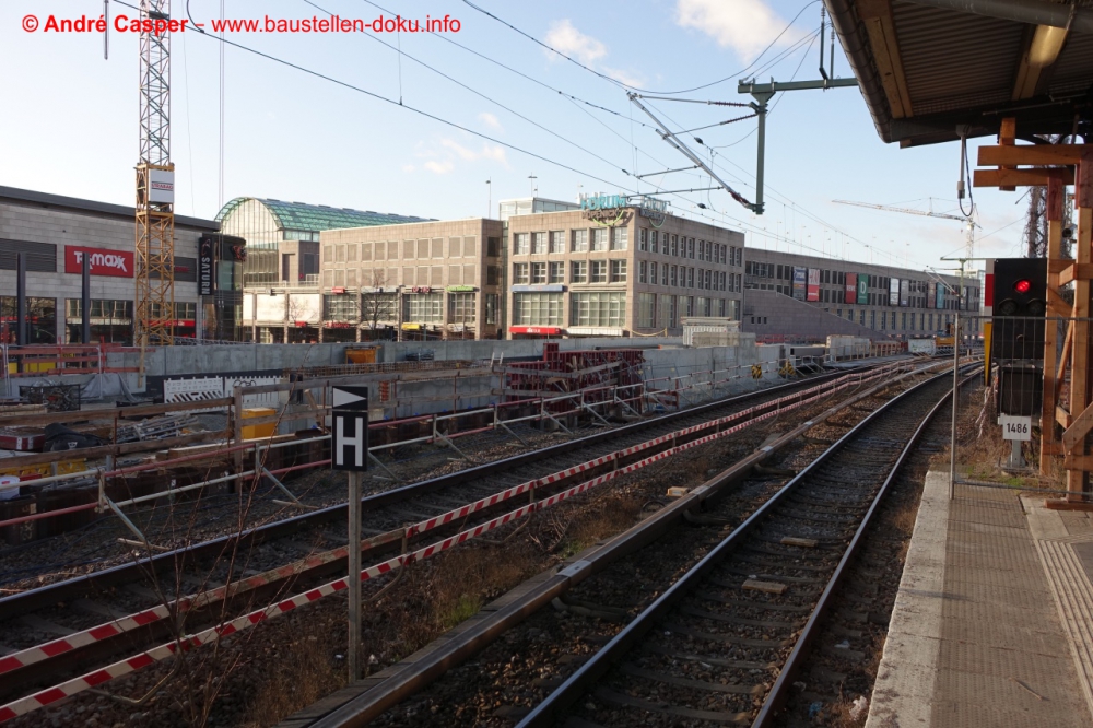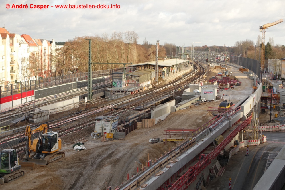 EÜ Hämmerlingstraße und EÜ Wuhle rohbaufertig; EÜ Bahnhofstraße (Süd) fertiggestellt; Bahnhofsgebäude und Stützwand am Elcknerplatz rohbaufertig; Fundamentarbeiten für den Regionalbahnsteig
