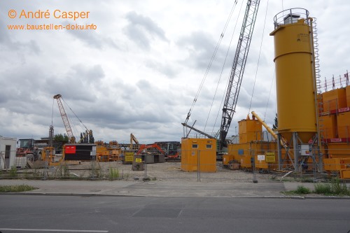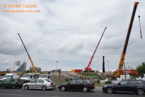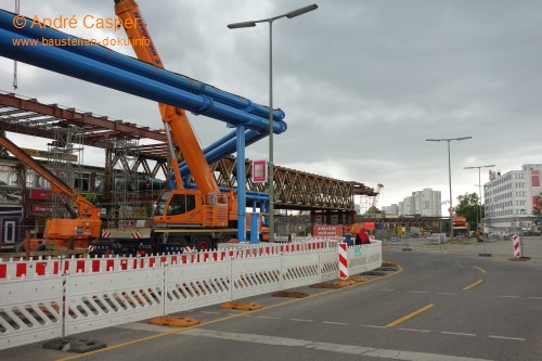 Umverlegung Sonnenallee; Baubeginn Trogbauwerk zw. Sonnenallee u. Dieselstraße; Einbau Eisenbahn-Hilfsbrücken; Baubeginn Tunnel Grenzallee