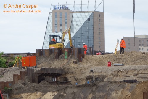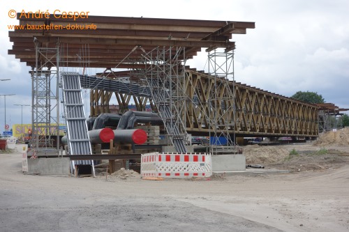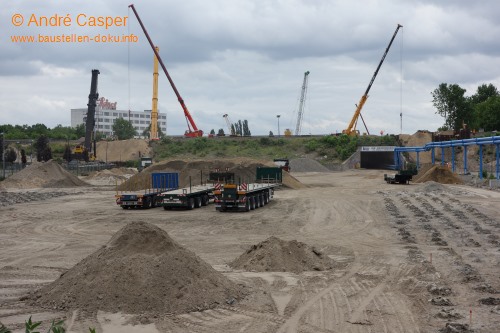 Umverlegung Sonnenallee; Baubeginn Trogbauwerk zw. Sonnenallee u. Dieselstraße; Einbau Eisenbahn-Hilfsbrücken; Baubeginn Tunnel Grenzallee