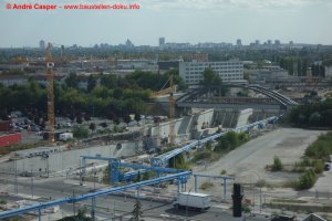 "Luftbilder" im Bereich Sonnenallee; Rohbau des Trogs weit fortgeschritten; Abbruch einer Schlitzwand mittels 500-Tonnen-Mobilkran