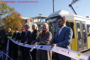 Abnahmefahrt auf der Neubaustrecke; Haltestellen und Gleisdreieck Adlershof weitgehend fertiggestellt; Straßenbau Sterndamm und Karl-Ziegler-Straße