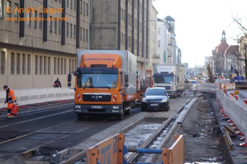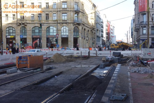 Fortschritt Gleisbau; Fertigstellung der Haltestellen; südliche Fahrbahn weitgehend fertig