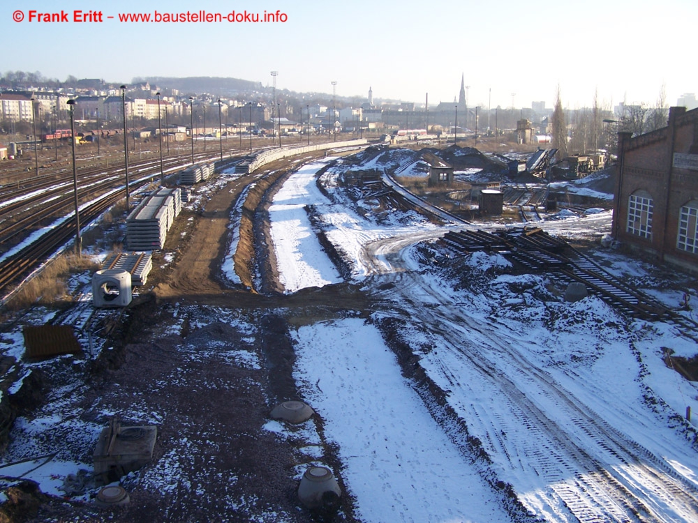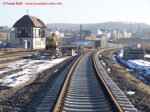 Am Hauptbahnhof werden die Bahnsteige abgebrochen. Nordanschluss am Knoten Tinz werden auf die ersten Gleise verlegt. Gleichzeitig noch Versorgungsleitungen. Die ersten Gleise wurden verlegt.