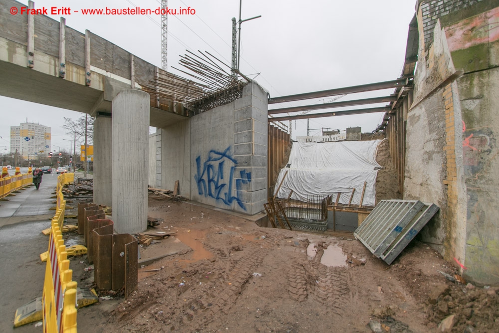 Errichtung der Brückenbauwerke (Mitte), erste Fundamente für den Aufzugsschacht des neuen HP Mockauer Straße